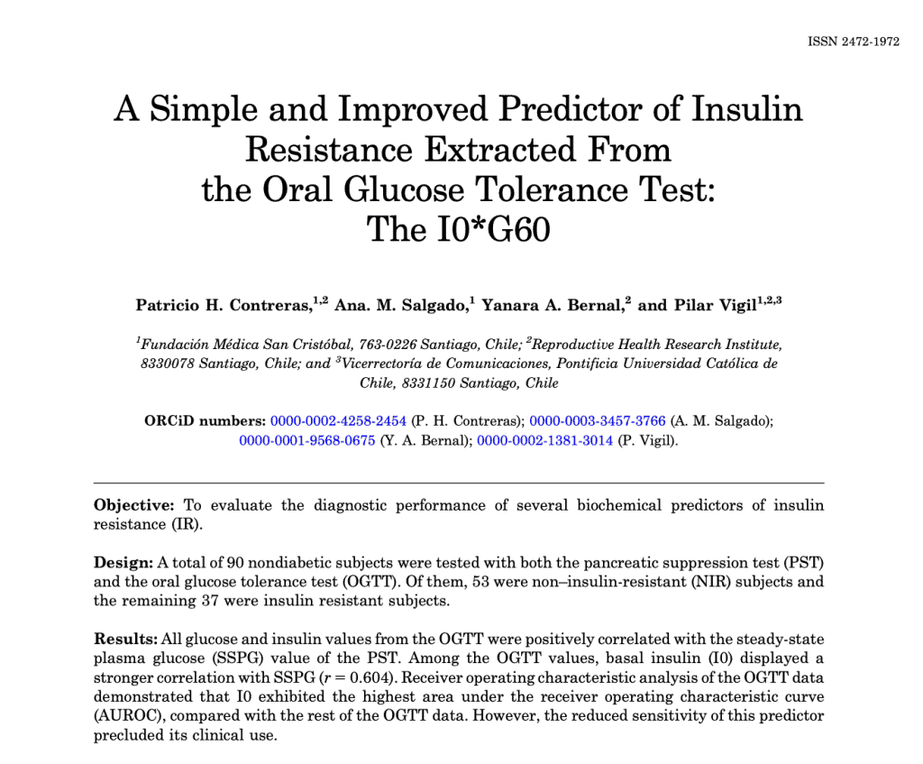 Introduction: The objective of this study is to evaluate the diagnostic performance of several biochemical predictors of insulin resistance (IR). A total of 90 nondiabetic subjects were tested with both the pancreatic suppression test (PST) and the oral glucose tolerance test (OGTT). Of them, 53 were non–insulin-resistant (NIR) subjects and the remaining 37 were insulin resistant subjects.