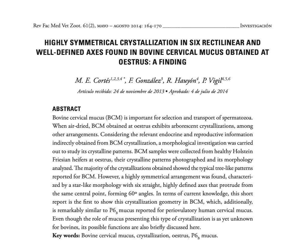 Introduction: Bovine cervical mucus (BCM) is important for selection and transport of spermatozoa. When air-dried, BCM obtained at oestrus exhibits arborescent crystallizations, among other arrangements. Considering the relevant endocrine and reproductive information indirectly obtained from BCM crystallization, a morphological investigation was carried out to study its crystalline patterns. BCM samples were collected from healthy Holstein Friesian heifers at oestrus, their crystalline patterns photographed, and its morphology analyzed. The majority of the crystallizations obtained showed the typical tree-like patterns reported for BCM. However, a highly symmetrical arrangement was found, characterized by a star-like morphology with six straight, highly defined axes that protrude from the same central point, forming 600 angles. In terms of current knowledge, this short report is the first to show this crystallization geometry in BCM, which, additionally, is remarkably similar to P6B mucus reported for periovulatory human cervical mucus. Even though the role of mucus presenting this type of crystallization is as yet unknown for bovines, its possible functions are also briefly discussed here.