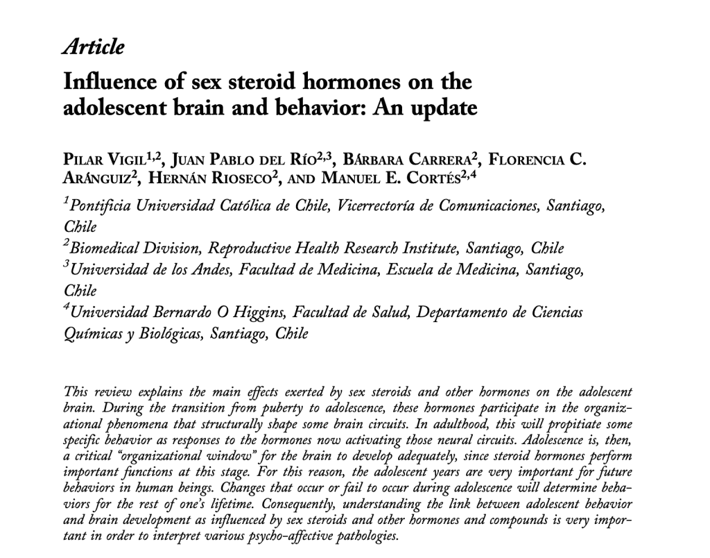 Introduction: The effect of steroid hormones on the development of the adolescent brain, and therefore, on adolescent behavior, is noticeable. This review presents their main activational and organizational effects. During the transition from puberty to adolescence, organizational phenomena triggered by steroids structurally affect the remodeling of brain circuits. Later in adulthood, these changes will be reflected in behavioral responses to such hormones. Adolescence can then be seen as a fundamental “organizational window” during which sex steroids and other hormones and compounds play relevant roles. The understanding of the relationship between adolescent behavior and the way hormones influence brain development helps understand some psychological disorders.