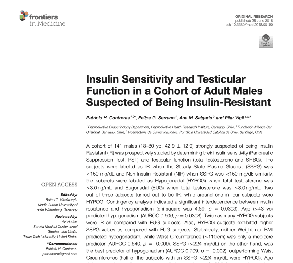 Introduction: A cohort of 141 males (18-80 yo, 42.9±12.9) suspected of being Insulin Resistant (IR) was prospectively studied by determining their insulin sensitivity (Pancreatic Suppression Test, PST) and testicular function (total testosterone and SHBG). The subjects were considered IR when their Steady State Plasma Glucose (SSPG) was ≥ 150 mg/dL and Non-Insulin Resistant (NIR) when their SSPG was < 150 mg/dL; similarly, the subjects were labeled as Hypogonadal (HYPOG) when their total testosterone was ≤3.0 ng/mL and Eugonadal (EUG) when their total testosterone was > 3.0 ng/mL. Subjects n=141 IR n=94 (66.66%) NIR n=47 (33.33%) HYPOG n= 37 (26.24%) 30 7 EUG n=104 (73.76%) 64 40 Chi-square was 4.69 and p was 0.0303, indicating a significant interdependence between insulin resistance and hypogonadism. Age (>43 yo) predicted hypogonadism (AUROC 0.606, p=0.0308). Neither Weight nor BMI predicted hypogonadism, while Waist Perimeter (>110 cm) was a predictor of hypogonadism (AUROC 0.640, p=0.009). SSPG (>224 mg/dL) was a significant predictor of hypogonadism (AUROC 0.709, p=0.002). Age did not predict insulin resistance, while Weight (>99 kg), BMI (>29), and especially, Waist Perimeter (> 100 cm, AUROC 0.812, p< 0.0001) were all significant predictors of insulin resistance. In conclusion, Waist Perimeter predicted both insulin resistance (> 100 cm) and hypogonadism (> 110 cm), suggesting that the first hit of abdominal obesity is insulin resistance and the second hit is male hypogonadism.