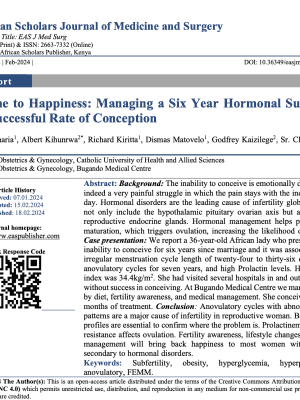 By: Sr. Juliet Macharia, Albert Kihunrwa, Richard Kiritta, Dismas Matovelo, Godfrey Kaizilege, Sr. Clotilda Chuma, Feredina John Abstract Introduction: The inability to conceive is emotionally distressing and indeed a very painful struggle in which the pain stays with the individual every day. Hormonal disorders are the leading cause of infertility ...