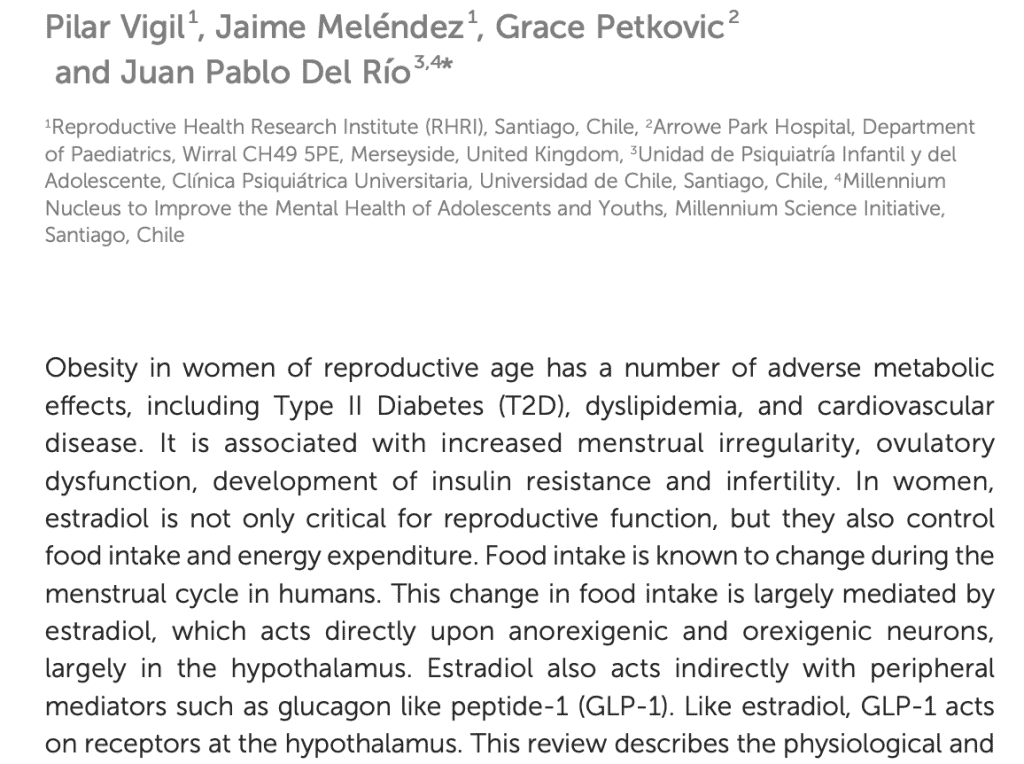 Introduction: Obesity in women of reproductive age has a number of adverse metabolic effects, including Type II Diabetes (T2D), dyslipidemia, and cardiovascular disease. It is associated with increased menstrual irregularity, ovulatory dysfunction, development of insulin resistance and infertility. In women, estradiol is not only critical for reproductive function, but it also controls food intake and energy expenditure. Food intake is known to change during the menstrual cycle in humans. This change in food intake is largely mediated by estradiol, which acts directly upon anorexigenic and orexigenic neurons, largely in the hypothalamus. Estradiol also acts indirectly with peripheral mediators such as glucagon like peptide-1 (GLP-1). Like estradiol, GLP-1 acts on receptors at the hypothalamus. This review describes the physiological and pathophysiological mechanisms governing the actions of estradiol during the menstrual cycle on food intake and energy expenditure and how estradiol acts with other weight-controlling molecules such as GLP-1. GLP-1 analogs have proven to be effective both to manage obesity and T2D in women. This review also highlights the relationship between steroid hormones and women’s mental health. It explains how a decline or imbalance in estradiol levels affects insulin sensitivity in the brain. This can cause cerebral insulin resistance, which contributes to the development of conditions such as Parkinson’s or Alzheimer’s disease. The proper use of both estradiol and GLP-1 analogs can help to manage obesity and preserve an optimal mental health in women by reducing the mechanisms that trigger neurodegenerative disorders.